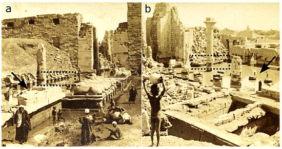 Two historical photographs from 1898 by B.W. Kilburn showing the first pylon of the Karnak Temples. The stone building materials are visibly affected by flash flooding, as indicated by black arrows and highlighted within dotted rectangles (a,b). From [59].