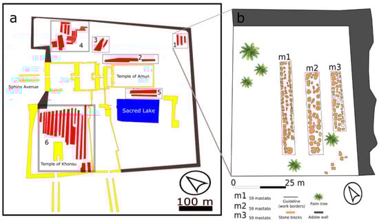 Master plan for the Temples of Karnak. (a) Scattered stone blocks are (in red), divided into six areas. (b) Case study area in the north east corner of the site, with current archaeological landscape.