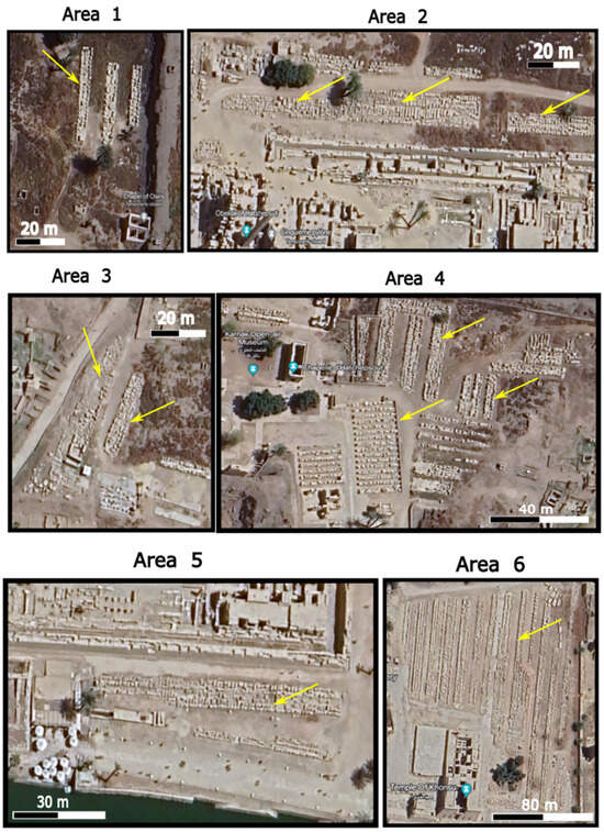 Satellite images depicting six different areas within the Temples of Karnak. The current positions of stone blocks are highlighted by yellow arrows in each image, providing a clear view of their distribution and placement within the temple complex. These images offer insight into the spatial arrangement and condition of the stone blocks, as observed in the present day (Areas 1–6).