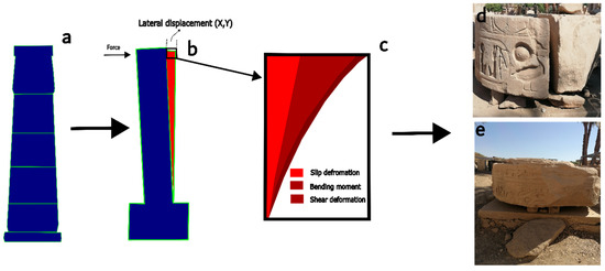 (a–c) Lateral displacements and deformation modes of the stone blocks in the study area in Karnak (d,e).