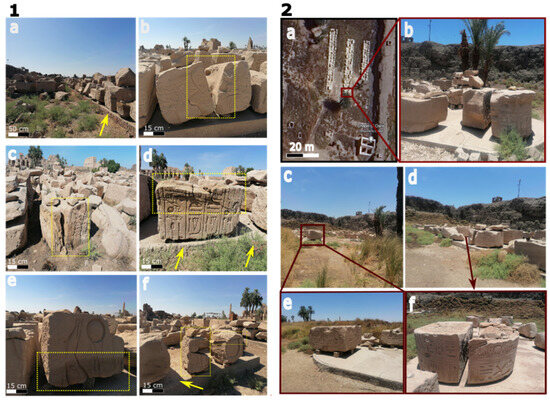 (1) and (2) Analysis of the mechanical impact of cumulative earthquakes and flooding events on the structures at Karnak. (1a) A general view showing scattered stone blocks, displaced due to mechanical forces, now resting on a loose red brick mastaba. (1b) Close-up of fractured stone blocks, illustrating the damage. (1c) Various stone blocks that have slid and become embedded in the soil, likely as a result of earthquake tremors or the impact of flooding waves. (1d–1f) Detailed views of mechanical chipping, fractures, and cracking observed on the stone surfaces, highlighting the extent of the damage. (2a) A Google Earth image of the study area, focusing on the northeastern part of Karnak, showing the current state of the stone blocks. (2b–2f) Documentation of various damage aspects of the stone blocks, including splitting, chipping, and fracturing, illustrating the ongoing deterioration of the site due to mechanical forces.