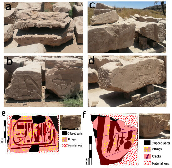 (a–d) Representation of various surface decay patterns observed on stone blocks within the Karnak Temples, including disintegration, flaking, polishing, pitting, and soiling. These patterns illustrate the effects of environmental factors on the stone material. (e,f) Detailed mapping of two specific deteriorated stone blocks, showcasing the extent and types of weathering forms present. This mapping highlights the impact of environmental conditions on the structural integrity of the stone blocks.