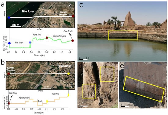 (a) Location of the case study area within Karnak, showing its elevation and relative position with respect to contaminated sources from east to west, based on global digital elevation models. (b) Elevation profile from west to east. (c) Sacred lake within the Temples of Karnak, with a yellow rectangle indicating the fluctuating water levels, which have led to the deposition of precipitates and soiling on the stone surfaces. (d,e) Examples of block surface disintegration and salt damage resulting from water impact.