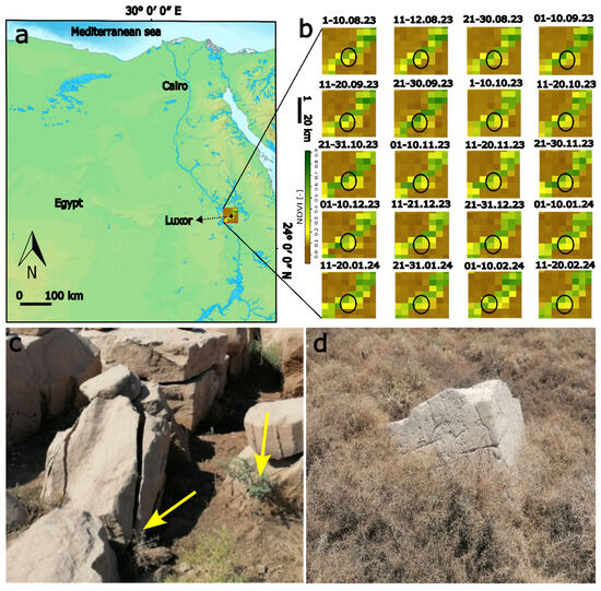 (a) General map of Egypt indicating the Luxor area with the NDVI Index. (b) Multi-temporal monitoring for the vegetation variations in Luxor and the case study area using the NDVI Index. (c,d) Loss of mechanical strength and physical and aesthetical properties due to the biodeterioration of the stone blocks and shown by yellow arrows.
