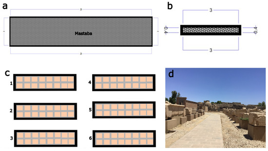 (a) The dimension of a Mastaba (20 m × 3 m); (b) cross-section of a Mastaba and its dimensions (3 m × 40 cm); (c) suggested system for six Mastabas constructions to lift around 144 stone blocks in the northeast corner (phase 1) over them. (d) Conducted a previous project to lift the stone blocks upon the Mastabas as part of the Karnak Open Museum (in front of the chapel of Hatshepsut), executed by the Egyptian Ministry of Tourism and Antiquity.