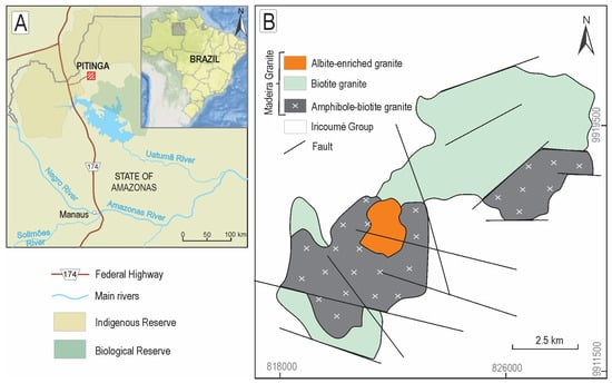 (A) Location map; (B) Geological map of the Madeira Granite (modified from Costi [22]).