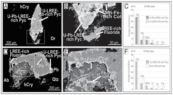 Well-preserved pyrochlore crystals appear homogeneous with light gray tones in backscattered electron images (Figure 4A) and primarily consist of U-Pb-LREE-rich pyrochlore. Along the grain borders, microfractures and cavities are surrounded by white U-LREE-Pb-rich pyrochlore (Figure 4B). This white coloration is attributed to gradual enrichment in Pb because the concentrations of other elements do not vary significantly (Figure 4C). The grain showing incipient alteration (Figure 4D) consists of U-LREE-Pb-rich pyrochlore, displaying lower Pb concentration in its central portions (min. 7.5 wt.% PbO, light gray) and higher Pb concentrations along the grain border and microfractures (max. 14.5 wt.% PbO, white). Within the same grain, Fe-U-Pb-rich pyrochlore is surrounded by columbite (Figure 4E), exhibiting an irregular shape and a composition depleted in LREE-Nb-Ta-F but enriched in U-Pb-Fe-Si compared to U-LREE-Pb-rich pyrochlore (Figure 4F). Thus, even in the best-preserved pyrochlore grains, there is evidence of alteration, likely resulting from hydration and significant leaching in magmatic pyrochlore. As the degree of alteration increases, compositional heterogeneity becomes more pronounced, primarily attributed to the early hydrothermal process. This process gave rise to secondary phases enriched in Pb found at the grain borders and along microfractures, and to the formation of columbite. Consequently, the most extensively altered pyrochlore remnants are included within columbite. Grains exhibiting advanced alteration no longer contain primary pyrochlore but instead show remnants of hydrothermal pyrochlore, along with abundant columbite and/or iron oxide, as well as other secondary minerals.