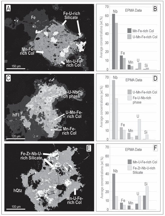 In the AGB, columbite within the same grain may exhibit heterogeneous composition. Mn-Fe-rich columbite is the predominant variety, with some portions enriched in elements inherited from pyrochlore, primarily U (Figure 5). The grain converted into columbite in Figure 5A consists predominantly of Mn-Fe-rich columbite, with subordinately Mn-U-Fe-rich columbite. The latter appears as irregular-shaped masses disseminated throughout the grain and has lower concentrations of Fe, Mn, and Nb, but higher concentrations of U and Si compared to the former (Figure 5B). Similarly, the grain in Figure 5C is composed of Mn-Fe-rich columbite, which surrounds irregular-shaped masses gradually richer in U. These masses consist of U-Mn-Fe-rich columbite and a Fe-U-Nb-rich phase, with the latter exhibiting significantly higher concentrations of U and Si (Figure 5D). The grain in Figure 5E is composed of Mn-U-Fe-rich columbite with anomalously high Si (Figure 5F), which surrounds irregular masses of Fe-U-Si-Nb-rich phase.