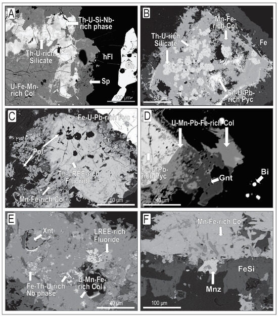 BSE images of miscellaneous products of pyrochlore alteration from the albite-enriched granite. (A) Detail of a U-Fe-Mn-rich Col surrounded by sphalerite, hydrothermal fluorite, and galena; inside the grain occur a relic of a Th-U-Si-Nb-rich phase and Th-U-rich silicate. (B) Inside the Mn-Fe-rich Col grain (gray) occur rounded pockets of Th-U-rich silicate (light gray) and relicts of Fe-U-Pb-rich Pyc (white); the set is surrounded by iron oxide (dark gray). (C) Th-LREE-rich fluoride grain (light gray), located at the edge of a Fe-U-Pb-rich Pyc grain (white) in contact with Mn-Fe-rich Col (gray) and polylithionite (black); detail of Figure 3D. (D) Likely genthelvite (dark gray) associated with U-Mn-Pb-Fe-rich Col (gray) at the border of Fe-U-Pb-rich Pyc; micro grains of native Bi occur included in the matrix. (E) Inside the U-Mn-Fe-rich Col occurs grains of xenotime, LREE-rich fluoride, and a Fe-Th-U-Nb-rich phase. (F) Monazite in between Mn-Fe-rich Col and Fe-rich silicate. Abbreviations: Bi = native bismuth, Col = columbite, Fe = iron oxide, FeSi = iron-rich silicate, Gnt = genthelvite, hFl = hydrothermal fluorite, Mnz = monazite, Pyc = pyrochlore, Sp = sphalerite, Xnt = xenotime.