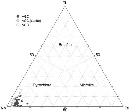 Pyrochlore–microlite–betafite classification expressed as percentages of Nb + Ta + Ti atoms. Abbreviations: AGC = albite-enriched granite core, AGB = albite-enriched granite border.