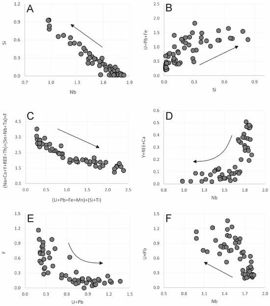The systematically low totals observed in the pyrochlore analyses can be attributed to several factors, including strong hydration of the mineral, metamictization (amorphization due to radiation damage), and the presence of voids. Niobium is the dominant substituent at the B-site in all pyrochlore crystals, with Nb2O5 concentrations ranging from 21.69 to 53.78 wt.%. Based on the relative proportions of Nb, Ta, and Ti in the B-site, all the samples belong to the pyrochlore group (Figure 7), as defined by Hogarth [51]. Silica (SiO2) is clearly substituting for Nb in the B-site, with concentrations ranging from 0.16 to 13.82 wt.%. There is a strong negative correlation (−0.97) between the amount of silica and niobium content (Figure 8A). While Hogarth [51] considered silicon to be present as an impurity in pyrochlore, it has been reported by Lumpkin and Mariano [52] and by Johan and Johan [53] that high SiO2 contents can be incorporated into the B-site of the pyrochlore lattice, reaching up to 7.9 wt.% and 10.12 wt.%, respectively.