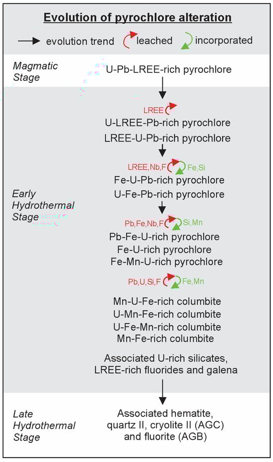 The alteration of U-Pb-LREE-rich pyrochlore in both AGC and AGB involves the loss of LREE and Nb, resulting in a progressive enrichment of Pb, U, Fe, and Si. This overall trend is shown in Figure 8C, although it should be noted that the alteration process is not a continuous progression. Through the detailed SEM study, corroborated by EPMA analyses, it was possible to compare samples with different degrees of pyrochlore alteration. This comparison reveals that the alteration process involved preferential leaching of specific cations in successive stages. It is important to note that the enrichments observed were not solely relative; there was also the incorporation of elements by the pyrochlore. Figure 9 summarizes the main exchanges that occurred during the alteration process. The first stage of alteration involved the leaching of LREE (Figure 8D). In the second stage, the loss of LREE was accompanied by losses of Nb and F, while Fe and Si were incorporated, leading to a significant relative enrichment in U and Pb (Figure 8E,F). This stage resulted in the formation of the most common variety of pyrochlore in the AGC, the Fe-U-Pb-rich pyrochlore (Table 1, analysis 6, 7, 8). In the third stage, losses of Pb and Fe began, along with continued losses of Nb and F. This gave rise to the varieties Pb-Fe-U-rich pyrochlore, Fe-U-rich-pyrochlore, and Fe-Mn-U-rich pyrochlore (Table 1, analysis 9, 10, 11, 12), which are the richest in U and are commonly found in the AGB and the central zone of the AGC. Previous studies by Minuzzi et al. [38] described continuous losses of Pb and Fe since the initial stage of alteration, which they attribute to the relative enrichment in U. However, these authors did not recognize and analyze the pyrochlores corresponding to the first two stages described in this study.
