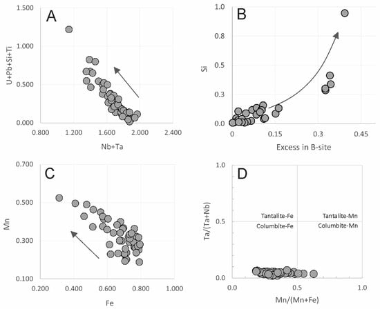 As the pyrochlore alteration progresses, a significant leaching of Pb occurs from its structure, leading to the collapse of the pyrochlore phase and the formation of columbite and other hydrothermal phases. Table 2 presents examples of columbite compositions, showcasing variations in Fe, Mn, and U contents. The observed compositions include (a) Mn-Fe-rich columbite, which is the most common composition found in both AGC and AGB (crystals 1, 2); (b) U-Mn-Fe-rich columbite, characterized by ~3 wt.% UO2 (crystals 3, 4); (c) U-Fe-Mn-rich columbite (up to 10.05 wt.% MnO2, crystal 5), observed only in the AGB and the central zone of AGC; and (d) Mn-U-Fe-rich columbite, typically exhibiting high U content (~6 wt.% UO2, crystals 6, 7, 8). The U-enriched columbite species are commonly associated with highly or completely altered pyrochlore grains. The presence of U in columbite is often, but not always, associated with Si, which ranges from 0.15 to 15.8 wt.% SiO2. In the general formula AB2O6, both U and Si occupy the B-site, substituting Nb and Ta, along with Pb and Ti (Figure 10A). The systematic excess in the B-site and the vacancy in the A-site are associated with high Si contents (correlation of 0.84, Figure 10B), suggesting a coupled substitution mechanism involving both the A- and B-sites in the columbite crystal structure, i.e., (Fe, Mn)2+ + 2(Nb, Ta)5+ → □A + 3(Si, U, Th, Ti, Sn)4+. The contents of REE2O3 (0.26–2.68 wt.%) in the columbite compositions are also unusually high compared to general studies of columbite composition [55,56]. The A-site in the columbite structure is occupied by Fe and Mn, which can substitute for each other (Figure 10C). All columbite crystals exhibit enrichment in Fe (from 7.69 to 16.13 wt.% FeO), and the majority of them are classified as columbite-(Fe) [57], with Mn/(Mn + Fe) atomic ratios ranging from 0.184 to 0.549 (Figure 10D).