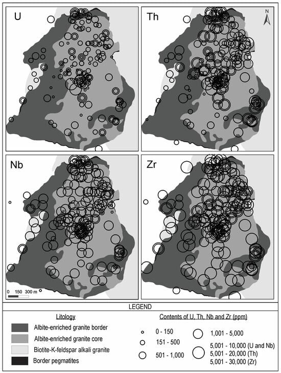 The maps depicting U, Th, Nb, and Zr concentrations in the AEG (Figure 11) reveal distinct patterns. The highest U values are observed in the northern, northeastern, and central regions of the granite body. The areas with the highest U grades coincide with the regions exhibiting elevated Nb concentrations. However, the distribution of U does not correspond to that of Zr, as Zr contents remain relatively consistent throughout the AEG. These findings suggest that the U mineralization within the AEG is predominantly associated with pyrochlore and its alteration products. While zircon is abundant, it exhibits low U grades, averaging 1.5 ppm UO2 in the AGC and 3.0 ppm UO2 in the AGB [41]. Notably, xenotime grains from the AEG do not display significant U concentrations [46], and thorite exhibits an average U content of 0.35 wt.% UO2 [18].