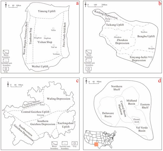 Regional geological overview of different basins. (a) Ordos Basin; (b) Southern North China Basin; (c) Guizhou area; (d) Permian Basin, US.