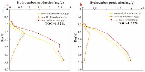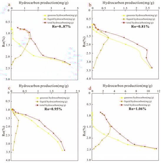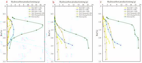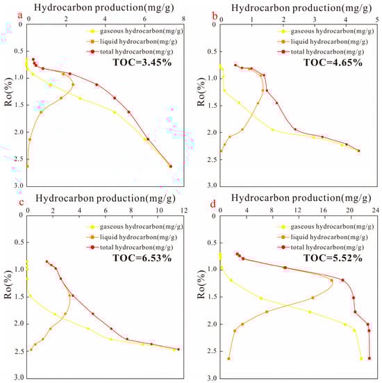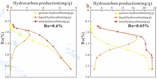 The total production of hydrocarbons is the aggregate of liquid hydrocarbon production and gaseous hydrocarbon production. The correlation between the total production of hydrocarbons and Ro can be categorized into three distinct stages (Figure 2c): (1) slow increase stage corresponding to thermal maturation Ro in the range of 0.65%–1.2%, with growth rates at various measurement points being less than 0.5 mg/g, and total hydrocarbon production ranging from 0.25 mg/g to 3.5 mg/g. (2) Rapid increase stage: the corresponding thermal evolution Ro ranges from 0.79% to 2.32%; at this stage, the total hydrocarbon production increased significantly, with production ranging from 1.1 mg/g to 18.7 mg/g. (3) Gradual increase stage: the corresponding thermal evolution Ro ranged from 1.19% to 3.38%; at this stage, the total hydrocarbon production increase rate tended to level off, with the maximum total hydrocarbon production ranging from 1.9 mg/g to 22.8 mg/g.