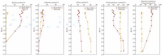 The samples primarily consisted of clay minerals, quartz, feldspar, and pyrite (Table 2). In the shale of well J601-1, clay minerals comprised 43%–53%, quartz 33%–43%, potassium feldspar 4%–5%, plagioclase 7%–9%, and pyrite less than 5%. The shale–clay mineral assemblage primarily consisted of kaolinites, chlorites, illites, and illite/smectite (I/S) mixed layers. Taking the shale from well J601-1 in the Ordos Basin and the outcrop in the Permian Basin as an example, as the temperature increased, shale maturity gradually rose and was accompanied by a progressive decrease in the content of kaolinite and chlorite, while the content of the illite and I/S mixed layer showed a gradual increase (Figure 3). The content of kaolinite in the well J601-1 decreased from 43% to 22% (Ro < 1.63%), then sharply dropped to 2% (Ro < 1.63%) and eventually disappeared; the shale at the outcrop had a low kaolinite content (Ro < 4%). The shale at the well J601-1 showed fluctuations in illite content between 9% and 12% at a Ro of 1.63%, and then decreased to 1% at a Ro of 2.63%, while the shale at the outcrop had an illite content that decreased from 8% (Ro = 0.71%) to 4% (Ro = 0.78%). The transformation of kaolinite to illite and I/S mixed layer was observed, with an increase in illite content from 11% to 17% as Ro increased from 0.6% to 2.63%; the I/S mixed layer content of aemon exhibited a significant increase from 35% to 82%, with an increase of over 50%. Conversely, the smectite content in the I/S mixed layer decreased from 65% to 30%, showing only a slight increase within the range of Ro between 0.76% and 0.82%. In the shale at the outcrop, as Ro increased from 0.7% to 2.65%, the illite content increased from 22% to 31%, while the I/S mixed layer content increased from 68% to 72%, with a slight decrease in smectite content within the I/S mixed layer.