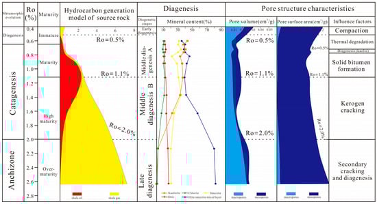 Early Diagenesis Stage: The Ro value of this stage is below 0.5%, representing the immature and low maturity periods of shale. Influenced by biotic and diagenetic processes, sediment transforms into kerogen, generating small amounts of biogenic methane gas [57]. Mesopores and macropores dominate the shale pore types, with mesopores being predominant. Compaction is the primary control factor for shale pore evolution [58]. As maturity increases, compaction leads to a reduction in mesopore and macropore volumes in shale. Under acidic conditions, chlorite is not produced, and kaolinite content reaches its maximum; under neutral or alkaline environments, a significant transformation from montmorillonite to illite or chlorite occurs. Diagenesis is weak at this stage.