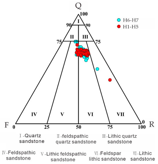 According to the industry standard for rock slice identification (SY/T 5368-2000), the rock type of the Huagang Formation sandstone reservoir in the Yuquan structure is mainly feldspar lithic sandstone, (Figure 2). Based on the whole rock mineralogy, the quartz content of the Huagang Formation sandstone reservoir is between 46.1% and 86.8%, with an average of 71.9%, the feldspar content is between 5.6% and 29.8%, with an average of 16.58%, and rock fragments content ranges from 10% to 55%, with an average of 19.9% (Table 1). The Upper Huagang Formation mainly comprises potassium feldspar, while the lower Huagang Formation mainly comprises plagioclase. The particle size is mainly medium, followed by fine, with the Upper Huagang Formation slightly coarse than the lower one. There are three main types of cementation in the Huagang Formation: kaolinite, quartz, and carbonate. The cements in the Upper Huagang Formation are mainly kaolinite, followed by quartz and carbonate minerals, with a quartz content of 3.2% and a carbonate content of 4.3%. The Lower Huagang Formation is mainly composed of carbonate and quartz, with contents of 6.5% and 5.7%, respectively.