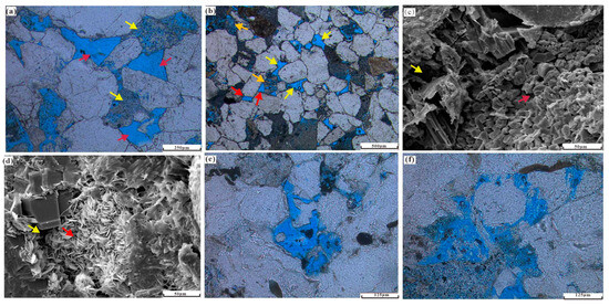 Pore types of the Huagang Formation of the Yuquan Structure in the West Lake Sag. (a) Carbonate dissolution pores (red arrow) and feldspar dissolution pores (yellow arrow), A well, Upper Huagang Formation, 3135.9 m, PPL. (b) Intergranular carbonate dissolution pores (yellow arrow), feldspar dissolution pores (orange arrow), and a small amount of residual primary pores (red arrow), A well, 3125.9 m, Upper Huagang Formation, PPL. (c) Feldspar dissolution pores (yellow arrow) and kaolinite intergranular pores (red arrow), A well, Upper Huagang Formation, 3134.9 m, SEM. (d) Chlorite intergranular pores (red arrow) and residual throats (yellow arrow), A well, Lower Huagang Formation, 4143 m, SEM. (e) Particle dissolution pore, C well, Lower Huagang Formation, 3989.8 m, PPL. (f) Particle dissolution pore, C well, Lower Huagang Formation, 3989.8 m, single polarized light (PPL).