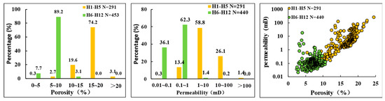 There are significant differences in physical properties between different layers of the Huagang Formation. The peak porosity of the Upper Huagang Formation is 15%–20%, with an average of 16.7%, while the peak porosity of the Lower Huagang Formation is only 5%–10%, with an average of 7.5%. The permeability of the Upper Huagang Formation is mainly in the range of 1–10 × 10−3 μm2, while the permeability of the sandstone reservoir in the Lower Huagang Formation is less than 1 × 10−3 μm2. The correlation between porosity and permeability in the Upper Huagang Formation is significantly better than that in the Lower Huagang Formation, reflecting the difference in pore composition between the two. In summary, the Huagang Formation reservoir is mainly composed of low-permeability and tight sandstone reservoirs [36], and the physical properties of the Upper Huagang Formation are better than those of the Lower Huagang Formation (Figure 4).