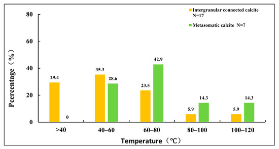 Calculation of temperature distribution histogram for oxygen isotopes of calcite with different occurrences in the sandstone of the Huagang Formation of the Yuquan structure.