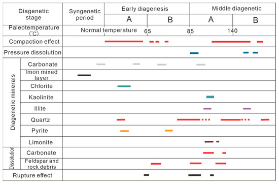 According to the maximum temperature of fluid inclusions in the study area of less than 170 °C (Figure 8) and quantitative analysis of X-ray diffraction of clay minerals of mudstone at a burial depth of 3750–4200 m in Well A and B, the S% in the I/S mixed layer is less than 20%. The S% of 4400 m in Well B is about is 10%, and the corresponding rock-eval temperature (Tmax) is only 415 °C. Consequently, it can be seen that the latest diagenetic stage of the sandstone reservoir of the Huagang formation of the Yuquan Structure is phase B of mesodiagenesis, and most sandstone reservoirs experienced phase A of mesodiagenesis. Based on the above achievements, a diagenetic sequence was established for the sandstone reservoir of the Huagang formation of the Yuquan Structure (Figure 9).