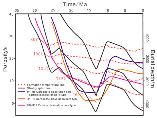 Based on the paragenetic relationship of the main diagenetic processes in porosity evolution the key diagenetic periods, and quantitative characteristics of various diagenetic processes on the reservoir, combined with ancient geothermal gradients in the study area, the chronological and quantitative evolution characteristics of porosities in the above three types of reservoirs of the Huagang Formation in the Yuquan structure, as well as their relationship with structural evolution were obtained (Figure 10).
