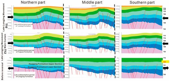 The Yuquan structure has roughly gone through three important stages of tectonic variations: extension and depression, strong compression, and compression adjustment (Figure 11). From the sedimentation period of the Pinghu Formation to the sedimentation period of the Huagang and Longjing Formations, the main transition period was from the early strong extensional background to the depression period of the Huagang Formation. After the sedimentation of the Upper Huagang Formation, the fault activity did not stop until the sedimentation period of the Longjing Formation. Faults of the period mainly developed in the Pinghu Formation and extended upwards to the Lower Huagang Formation, causing feldspar dissolution in the sandstone distributed in the fault development area of the Lower Huagang Formation and partial particle dissolution.