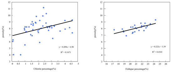 Sandstones with relatively good physical properties in the Lower Huagang Formation of the Yuquan Structure generally have chlorite on the particle surface, and the content of chlorite is positively correlated with porosity. Microscopic characteristics show that the formation of chlorite in this period was early, mainly formed at the time of point-line contact. Energy spectrum analysis results show that chlorite in this period has high levels of Fe2O3 and MgO (Figure 12). The fine-grained sandstones in the Huagang Formation in the study area have well-developed mica and I/S mixed clay. These minerals are prone to hydration and release iron ions, magnesium ions, etc., in the contemporaneous period, and under the combined action of a weak alkaline sedimentary environment in the Lower Huagang Formation, they are prone to form chlorite. The chlorite on the surface of particles inhibits the formation of other diagenetic minerals during early burial periods, such as the early overgrowth quartz. The chlorite on the surface of particles makes sandstone have better permeability for a long burial time. It is beneficial for the dissolution of detrital feldspar in the fault development zone during early to middle burial periods and it also further weakens the strength of pressure dissolution of particles due to tectonic compression during the period of structural inversion, thus forming relatively good reservoirs. In both the Upper Huagang Formation and Lower Huagang Formations, particle dissolution pores are formed by the dissolution of feldspar and rock debris, especially in the sandstone of the Lower Huagang Formation. The particle dissolution pores in the Lower Huagang Formation account for 65% of the total pores. It can be seen that to form reservoirs of the Lower Huagang Formation, the source material needs to have a relatively rich content of feldspar. The relationship between feldspar and porosity (Figure 13) also indicates that one of the prerequisites for reservoir formation in the Lower Huagang Formation sandstone is a high-content feldspar source.