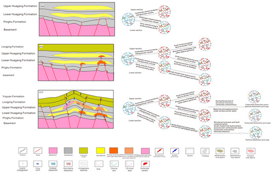 During the initial deposition of clastic particles, the original intergranular volume is large. In the early stages of sedimentation, a large amount of intergranular carbonate cement precipitated, occupying a large amount of intergranular space and reducing reservoir quality, while also providing sufficient material basis for later dissolution (Figure 14a). Under influence of the Huagang movement, as faults penetrate the reservoir, some aluminum silicate minerals in the feldspar/lithic fragments undergo dissolution, forming grain dissolution pores and a small amount of authigenic kaolinite, quartz, and other dissolution products (Figure 14b). Controlled by the Longjing Movement during the period of structural inversion, intensified fault activity led to the infiltration of acidic atmospheric water along the faults into the sandstone. This results in significant dissolution of the carbonate cement which occupied intergranular volume in the early stage, forming carbonate dissolution pores. Consequently, the reservoir properties are significantly improved, leading to the formation of a reservoir dominated by carbonate dissolution pores and grain dissolution pores as the primary storage space type (Figure 14c).