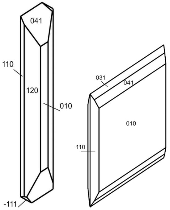 Calcioveatchite occurs in a massive, granular halite-sylvite rock (sylvinite) or in a sylvite-carnallite rock and is also associated with boracite, hilgardite (hilgardite-1A), kurgantaite, hydroboracite, volkovskite, veatchite, anhydrite, magnesite, and quartz. Calcioveatchite forms separate prismatic or tabular crystals up to 1 × 1.5 × 3 mm3 and crystal clusters up to 3 mm across (Figure 1, Figure 2, Figure 3 and Figure 4). Sometimes it is intimately associated with boracite and/or anhydrite (Figure 3). The major forms of monoclinic (symmetry class 2) crystals of calcioveatchite are monohedra {010} and {0-10} and dihedra {110}, {120}, {041}, {031}, and {-111} (Figure 3); subordinate or rare forms are {100}, {1-10}, {1-20}, {130}, {140}, {021}, {011}, and {1-11}: see []. Simple twins with contact face {0-10} were observed.