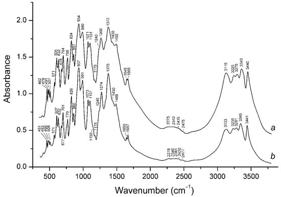 Figure 5. Powder infrared absorption spectra of (a) veatchite from Shoktybay, Western Kazakhstan, and (b) holotype calcioveatchite.