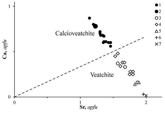 Figure 6. The atomic Sr–Ca ratio in minerals of the calcioveatchite–veatchite isomorphous series: 1–2—calcioveatchite from Nepskoe (2—holotype); 3–7—veatchite: 3—Nepskoe, 4—Shoktybay, 5—Chelkar, 6—Tick Canyon, 7—Billie Mine.
