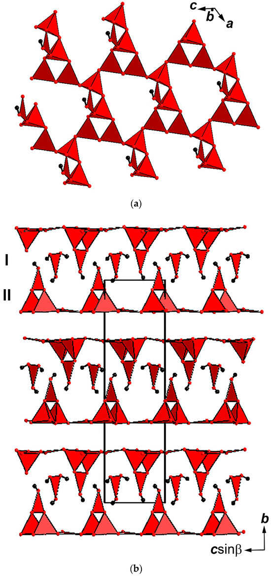 As mentioned above, three polytypes of veatchite Sr2B11O16(OH)5·H2O are known, namely veatchite-1M, veatchite-2M, and veatchite-1A (Table 8). The crystal structure of any of them is based upon three-layer sheets with the central layer formed by Sr-centred eleven-fold and ten-fold polyhedra sandwiched between two borate layers []. According to the structural classification of borates [], veatchite is considered as a sheet borate, and two types of fundamental building blocks (FBBs) are distinguished in its structure []. FBB I can be presented using the code 3∆2⎕,1∆:<∆2⎕>-<2∆⎕>,∆ which means two three-membered rings, one consisting of one B-O triangle and two B-O tetrahedra and another consisting of two triangles and one tetrahedron; an isolated triangle [B(OH)3] is also a part of FBB I. Closely related FBB II corresponds to the code 3∆2⎕:<∆2⎕>-<2∆⎕> (Figure 7a) which means the same construction of two three-membered rings but without an isolated triangle [B(OH)3]. Triclinic and monoclinic polytypes are characterized by different sequences of FBBs which result in centrosymmetric (veatchite-1A) or non-centrosymmetric (veatchite-1M and -2M) structures. Both monoclinic polytypes have an identical sequence of FBBs but differ from one another by a slight shift between layers []. The sequence of FBBs I and II in the structure of veatchite-1M is shown in Figure 7b. The modular approach to veatchite polytypes and structurally related natural and synthetic borates is reported in detail in [].
