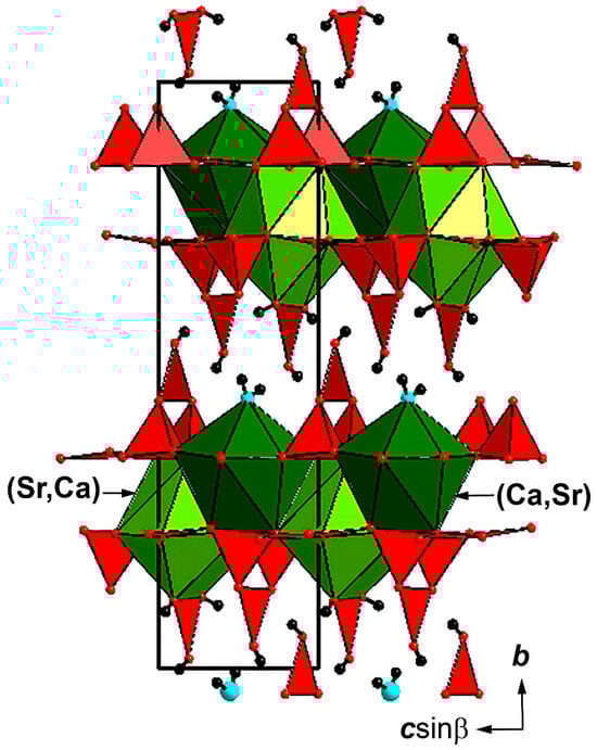 As our EMPA data show (Table 1, Figure 6), the Ca–Sr ratio in the studied samples demonstrated wide variation: CaO content varied from 0.1 to 8.1 wt.% and SrO from 35.2 to 17.1 wt.%; that corresponds to a range from Sr2.00Ca0.01B10.99O16(OH)5·H2O to Sr1.14Ca0.87B10.99O16(OH)5·H2O.