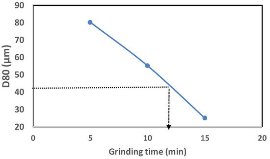 The fine mineral grain size of 25 µm, as measured by MLA and SME-EDS, implies a target of a D80 of at least 45 µm for the ground product. This is achieved by 12 min of grinding of a 1.0 kg ore batch in the above-described rod mill and interpolated on the D80 vs. time graph shown in Figure 1.