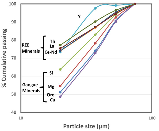 The ore is relatively soft with a Bond Work Index of 10 kWh/t, which is anticipated for a carbonate ore. The D80 of the 12 min ground ore is 45 µm as measured with a Malvern Mastersizer 3000 (Malvern Panalytical, Malvern, England). The ground ore was sieved on size intervals 74/53 µm, 53/38 µm, 38/20 µm, and −20 µm to obtain the size fractions to be assayed for their REE contents. The distributions of mass (ore) and various elements in the different size fractions are shown in Figure 2. The finer size distributions of La, Nd, and Ce compared to gangue elements are an indication that these elements may belong to minerals that are more friable than the gangue minerals. Yttrium shows a different distribution compared to other REEs, indicating that yttrium is found in different minerals as well. It is also possible that some fine REE mineral grains could be encapsulated into coarser particles of gangue minerals, a hypothesis that can be assessed by MLA measurements if an in-depth analysis becomes necessary.