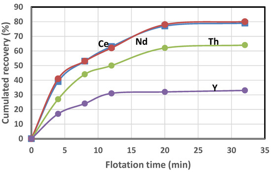 Figure 4 shows the test 33 (Table 2) cumulative recoveries of Ce, Nd, Y and Th vs. time, as calculated using Equation (3). Only Ce, Nd and Y are shown to avoid overcrowding the graph, and also because the heavier REE contents (Sm to Lu) are low, making the XRF assays weakly reproducible, which leads to noisier recovery/time curves than those for Ce, Nd, and Y. Ce and Nd fall exactly on the same curve which indicates that the two elements are equally distributed between the same REE minerals of the ore. This is not the case for yttrium, which is likely present in REE minerals that do not respond to flotation, as well as the minerals that carry Ce and Nd. The same comment applies to thorium, which is usually more concentrated in monazite than bastnaesite [1], suggesting that monazite could float slower than bastnaesite, as will be verified below.