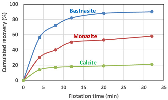The previous results show that when studying the response of an REE ore to a concentration process, one should not only look at the response of a single element, as this element could be distributed within several REE minerals that respond differently to the concentration process. Ideally, one should consider the responses of the REE minerals rather than those of the REE. Indeed, instead of elemental assaying, one can measure the mineral contents of the flotation samples using a quantitative scanning electron microscope (SEM) with energy-dispersive spectroscopy (EDS), for instance, MLA (Mineral Liberation Analysis) or QEMSCAN [8]. It is also possible to estimate the mineral composition from elemental assays [23], an approach less expensive and time-consuming than MLA and which can yield comparable results to quantitative SEM-EDS [24]. The estimation of the mineral contents from the elemental assays for the considered flotation test results allowed for the calculation of the mineral recovery-time curves shown in Figure 5, where the faster and better flotation response of bastnaesite compared to monazite is confirmed and is consistent with results of other researchers [8].