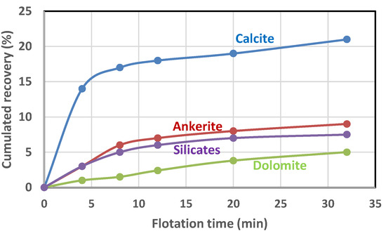 Figure 5 also shows that calcite (CaCO3), the second most abundant gangue mineral, is depressed, as are the other gangue minerals, as shown in Figure 6. The linear gangue mineral increase with respect to time (Figure 6) suggests that the recoveries of the gangue minerals into the floated products are probably a combination of true flotation (due to insufficient liberation or depression) and hydraulic entrainment [14]. The quantification of the two mechanisms would require assaying the size fractions of each flotation product to obtain the mineral recovery as a function of particle size or using an entrainment tracer, both of which are not available here. Obtaining the mineral recoveries as a function of particle size would have required isolating the ore within size classes below 20 µm (635 mesh), which accounts for more than 50% of the ore (Figure 1). Such partitioning requires the use of a cyclosizer or ultrafine screens that are not available at the time of the test work. Also, the mass of floated material is small (less than 30 g for 32 min of flotation), which poses the problem of not having sufficient ore for assaying, especially if the material is to be separated into size fractions. To carry out such an investigation, the flotation tests should be repeated with the floated products combined to provide sufficient material for the analysis of the size fractions, or the size of the ore batches has to be increased. Such an adjustment of the test procedure is planned for subsequent testing.