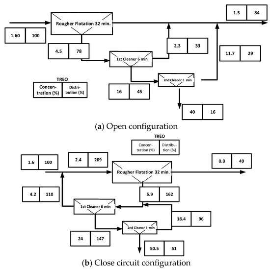 Open cleaning circuit simulations show that a minimum of two cleaning stages are necessary to produce a concentrate assaying 40% TREO. The simulation results for the open circuit configuration are summarized in Figure 7. The process can be optimized by adjusting the flotation time in the rougher and cleaning stages. The low REO recovery of 16% in the final concentrate is unacceptable due to the open circuit configuration for which the cleaner rejects are directed to the tailings, while their TREO contents are above that of the circuit feed. In practice, the cleaner should be circulated back to the upstream flotation stage, as shown for the closed circuit of Figure 7b. The study of such a closed circuit configuration in the laboratory implies carrying out locked cycle flotation tests [26] or continuous mini-piloting, both of which are costly, time-consuming, and seldom documented for REE ores. On the other hand, the simulation of a locked cycle test can readily be programmed in Microsoft ExcelTM (version 2407) and used to anticipate the results of a laboratory locked cycle test, as shown in Figure 6b. Results indicate an increase in TREO recovery from 16% for the open configuration to 51% for the closed one. The closed configuration could also increase the concentrate grade from 40% TREO to 50% TREO because the recirculation of the cleaner rejects to the upstream flotation banks increases the TREO content of their feed. The predicted requirement of two cleaning stages to produce a 40% TREO concentrate appears credible, as Mountain Pass reported using three to four cleaning stages to reach 60% TREO [1].