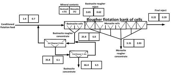 As indicated earlier, because of the different hydrometallurgical routes and impurity management, it may be appropriate to consider separating bastnaesite from monazite. The batch flotation tests clearly show that, for the studied ore, the flotation of bastnaesite using hydroxamic acid is faster than that of monazite (Figure 5). Simulation is used here to assess if an acceptable bastnaesite/monazite separation is possible by designing a flotation circuit giving short residence times in the rougher and cleaner banks to take advantage of the faster flotation rate of bastnaesite. The concept is illustrated in Figure 8. In practice, taking advantage of some particular mineral kinetics does not require special equipment if flotation is carried out in a bank of mechanical flotation cells. Taking advantage of the differences in mineral flotation rates is not an academic fantasy as it is already practiced in sulfide ore flotation for nickel–copper separation, for instance [27]. Typically, the first rougher flotation cell concentrates are directed toward a separate circuit from the one that receives the concentrates of the downstream cells of the bank. It is also akin to the principle used by flash flotation, which is also industrially accepted [28].