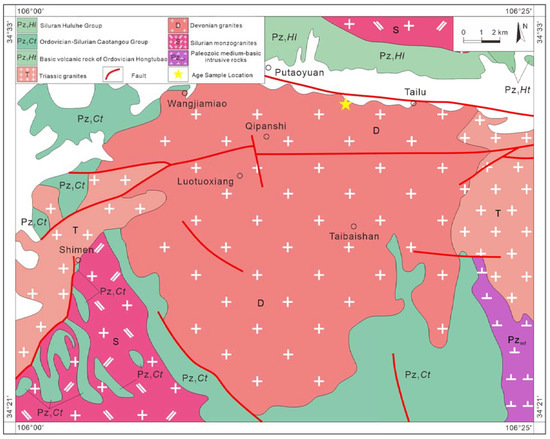 Research on the granite magmatism of different ages and origins in the Wushan–Shangdan Ocean (WSO) can effectively reveal and differentiate the subduction, collision, and exhumation periods [2]. This lays a significant foundation for the collision tectonics of the Early Paleozoic WSO within the QQCZ. In order to clarify the late tectonic progression of the Proto–Tethys Ocean in this region, this paper focuses on the Tailu pluton (TP) located in the QQCZ by combining new data and recent regional geological research findings. We conduct petrology, geochemistry, zircon U–Pb geochronology, and zircon Lu–Hf isotope studies to determine the origin and chronological age of the igneous rock to trace the melt generation zone and formation’s tectonic background. Combined with the results of previous studies, the WSO orogeny in the QQCZ is shown to have ended in the Early Devonian and entered the intraplate magmatism process at about 410 Ma. This indicates the Early Paleozoic tectonic evolution of the northern branch of the Proto–Tethys Ocean (Wushan–Shangdan Ocean).