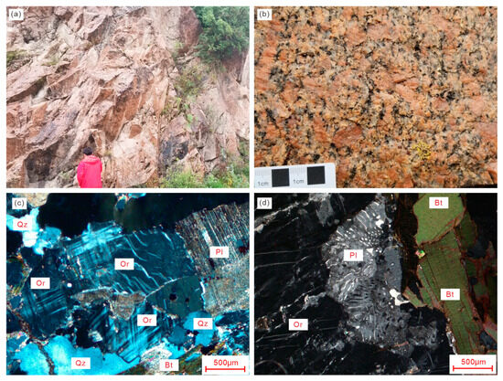 The syenogranite is medial-to-coarse in texture, partly consistent with pseudoporphyritic granite, and has a blocky structure. The syenogranite comprises orthoclase (50% to 60%), plagioclase (15% to 20%), quartz (15% to 20%), and biotite (5% to 10%). The accessory minerals are mainly zircon, apatite, sphene, ilmenite, and monazite (Figure 3c). The monzogranite exhibits a medium–coarse grained texture with a massive construction, with myrmekite occasionally appearing locally (Figure 3d). The monzogranite samples consist of orthoclase (35% to 45%), plagioclase (25% to 30%), quartz (25% to 30%), biotite (2% to 5%), and a few other accessory minerals (apatite and sphene).