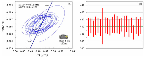 The zircons (TS19039-1) of Tailu syenogranite range in length from 50 to 220 μm, with aspect ratios varying between one to one and four to one. Most grains exhibit well–developed oscillatory zoning (Figure 4a). In the 25 analysis spots, 23 spots exhibit concordant U-Pb ages, as well as high U (183 to 968 ppm) and Th (258 to 1224 ppm) concentrations, with Th/U ratios ranging from 0.71 to 2.58, consistent with typical magmatic zircons (Figure 5). The 206Pb/238U ages of the 23 spots range from 402 to 414 Ma (Figure 4b), with a weighted mean age of 410.5 ± 2.3 Ma (MSWD = 0.24, n = 23).