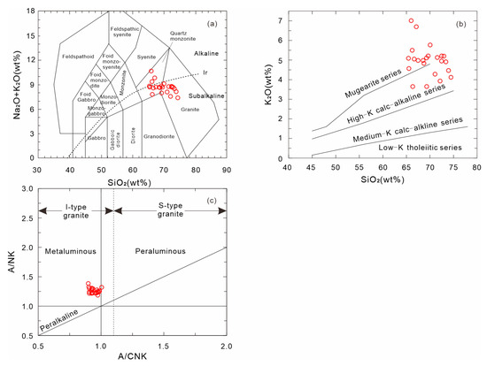 (a) TAS diagram [66]; (b) K2O vs. SiO2 diagram [67]; (c) A/NK (molar Al2O3/[Na2O + K2O]) vs. A/CNK (molar Al2O3/[CaO + Na2O + K2O]) diagram [68].