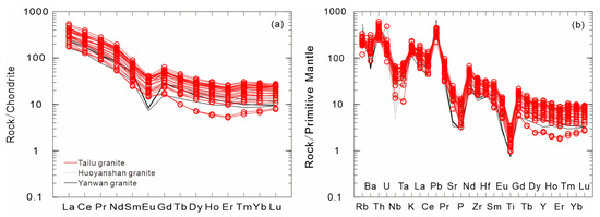 Chondrite-normalized REE patterns (a) and primitive mantle normalized trace element spider diagrams (b) of the Tailu pluton in the Qinling–Qilian Conjunction Zone. The chondrite and primitive mantle values were taken from Sun and McDonough [65]. Huoyanshan granite [31] and Yanwan granite [28] were located in the Qinling–Qilian conjunction zone.
