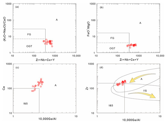 Granite type discrimination diagram of Tailu pluton in the Qinling–Qilian conjunction zone: (a) (Zr + Nb + Ce + Y) vs. (K2O + Na2O)/CaO; (b) (Zr + Nb + Ce + Y) vs. FeOT/MgO; (c) Ce vs. 10,000Ga/Al; (d) Zr vs. 10,000Ga/Al. FG = fractionated felsic granites; OGT = unfractionated I- and S-type granites; A = A-type granite [73].