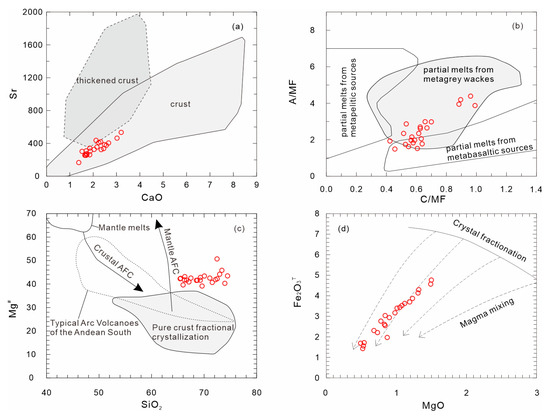 The source region diagrams of the Tailu pluton in the Qinling–Qilian conjunction zone: (a) Sr vs. CaO [84]; (b) A/FM vs. C/FM [87]; (c) Mg# vs. SiO2 [88]; (d) Fe2O3T vs. MgO. AFC: assimilation and fractional crystallization.